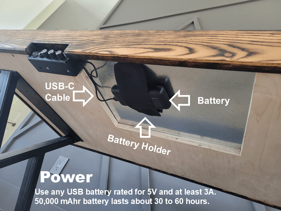 Low power, USB-C. Only requires 15W (5V and 3A) which modern phone chargers and battery banks can provide.