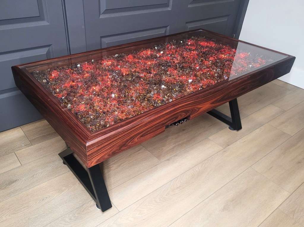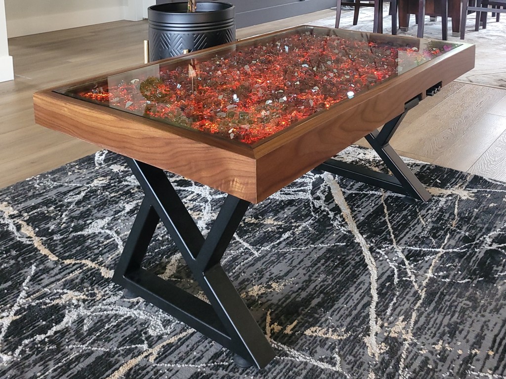 Oak coffee table with epoxy on exposed fireglass and metal legs.