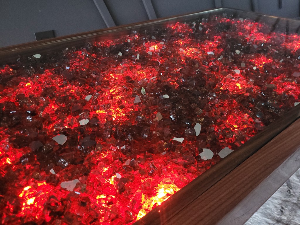 This coffee table is made from solid black walnut. A plywood base connects metal legs to the walnut frame. Legs can be made from wood or metal and custom requests are welcome. A holder connects a USB battery to the bottom of the table and makes it easy to remove the battery for charging.